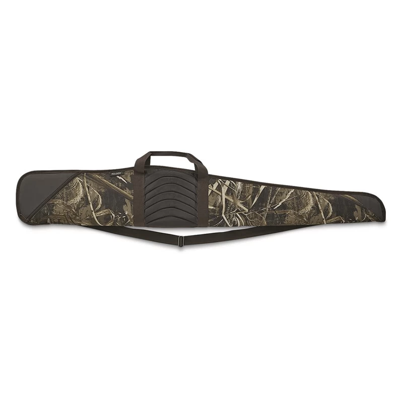 The Bulldog Pinnacle shotgun case is 52 inches long. Fits guns up to 50 inches. Height is 7 inches inside measurement. Bulldog Cases deducts 2 inches to give room for the zipper. Shotgun case features 2 1/4 inch soft padding, full length zipper with pull, a soft fur inner lining for maximum protection, an extra-large size zipper closure accessory pocket, and has raised rib panels for extra protection.