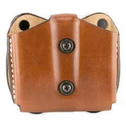 This double magazine pouch features a snap-to-the-belt design. May be carried horizontal or vertical. Accommodates belts up to 1-3/4 inches wide. Fully adjustable dual tension device. Please note: pouch for small caliber guns may only fit belts up to 1-1/2 inches and may only have the vertical belt slots.