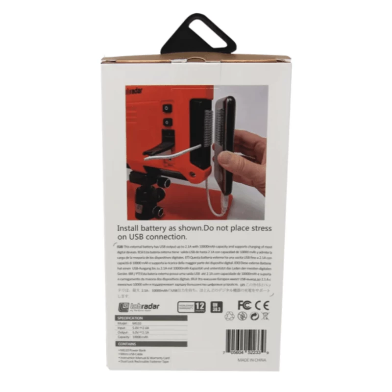 A rechargeable USB battery bank is the perfect solution to power LabRadar. While the system works great on AA batteries you can extend the shooting day with this 10,000 mAh rechargeable power bank. It is supplied with heavy duty 3M Dual Lock reusable fastening tape to attach the power pack to your Labradar. A USB cable is supplied to connect to your LabRadar. The power pack is also compatible with cell phones and tablets. The battery also has a Type C connection for charging other devices.