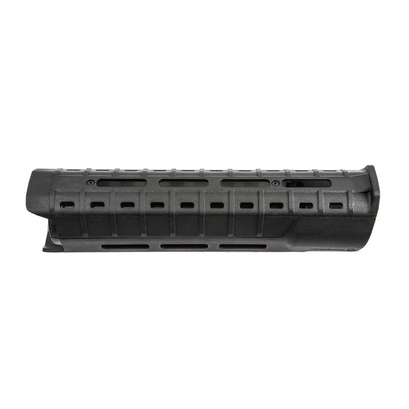 Reinforced, heat-resistant polymer construction provides operational durability without the weight and expense of an aluminum rail hand guard. A large front extension and lower lip protects the user from the hot front sight assembly and maximizes useable hand guard length.