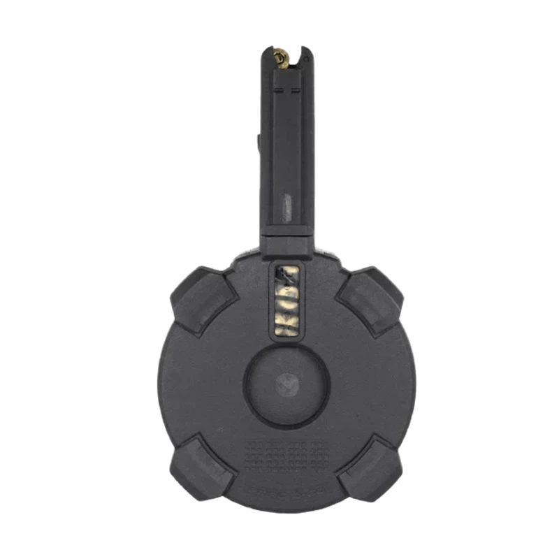 The unique drum configuration keeps the height of the magazine manageable and allows for prone firing and easier storage. Features an easy-to-use loading lever, paint pen dot matrix for easy marking, and a rear window for instant capacity indication.