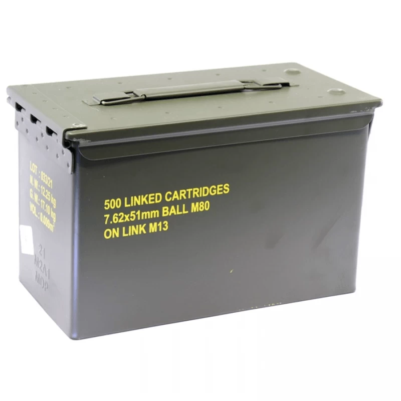 Full Metal Jacket projectiles are the ideal choice for training, target shooting and general range use. Magtech FMJ ammunition delivers reliable, accurate performance on the range. Belted with M13 link. Once the ammunition is gone, the Ammo Can has hundreds of uses around the home, shop or range. This can size was designed to hold 30 caliber belted machine gun ammunition but has been adopted to hold demolition ignition systems and many other items. The Ammo Can features sturdy steel construction with waterproof seals. New production, this can is perfect to store ammunition in for years, or shoot the ammo up and put any number of items in the can!
