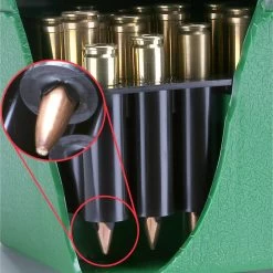 Specially designed for shooters who require a 100 round supply of very accurate ammunition. The CASE-GARD R-100 Deluxe ammo boxes provide excellent protection for your reloads. When the rounds are in the down position, they are protected by four special fingers, which keep your bullets from hitting the bottom of the box and causing tip damage. Which can change flight characteristics. It comes with adjustable inner trays which offer two height positions for. By rotating the tray, two height positions can be achieved in the box to accommodate different cartridge lengths. As you can see the Max. OAL UP will be shorted than when the bullet is in the down position. Bullets can be stored up or down for most calibers. Made from virtually indestructible polypropylene and comes with MTM’s 10 Year Guarantee. This textured box comes with a handle for easy transportation. The R-100 Deluxe comes in two sizes that will cover the vast majority of all modern ammunition.