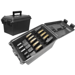 Specially designed for shooters who require a 100 round supply of very accurate ammunition. The CASE-GARD R-100 Deluxe ammo boxes provide excellent protection for your reloads. When the rounds are in the down position, they are protected by four special fingers, which keep your bullets from hitting the bottom of the box and causing tip damage. Which can change flight characteristics. It comes with adjustable inner trays which offer two height positions for. By rotating the tray, two height positions can be achieved in the box to accommodate different cartridge lengths. As you can see the Max. OAL UP will be shorted than when the bullet is in the down position. Bullets can be stored up or down for most calibers. Made from virtually indestructible polypropylene and comes with MTM’s 10 Year Guarantee. This textured box comes with a handle for easy transportation. The R-100 Deluxe comes in two sizes that will cover the vast majority of all modern ammunition.