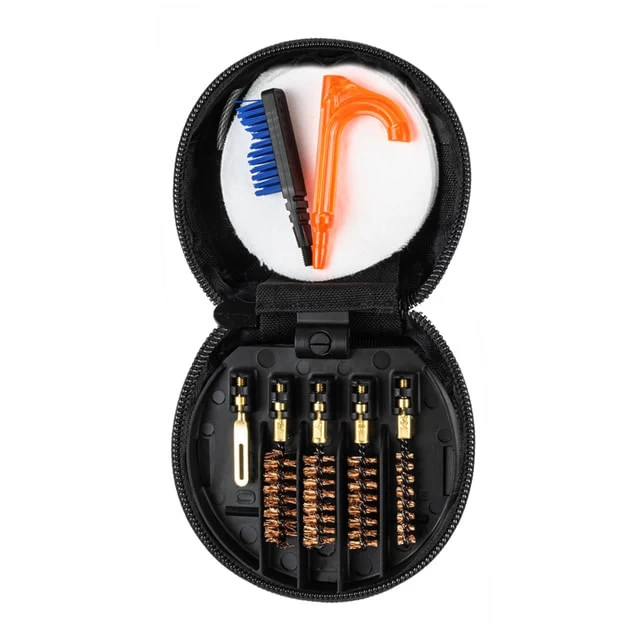 Whether competition shooting or plinking in the backyard, this gun cleaning kit covers proper maintenance for pistols and also includes additional tools for precision cleaning. The unique cotton patches create swabs for 360 degree coverage, ensuring a proper Breech-to-Muzzle clean for .22 cal -.45 cal. pistols. Four bore brushes are included: .22 cal, .38 cal/9mm, .40 cal & .45 cal. This cleaning kit is proudly made in the USA and contained in a lightweight, compact soft pack case.