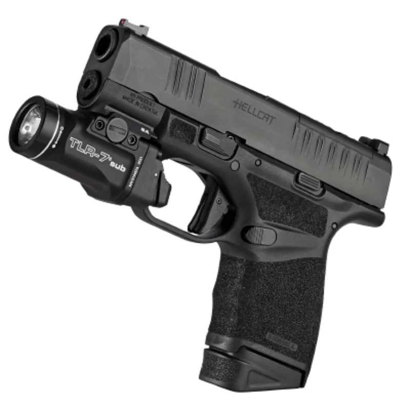 Designed to enhance visibility and targeting capability, the lightweight TLR-7 sub weapon light securely attaches to select subcompact handguns: GLOCK 43X MOS/48 MOS and GLOCK 43X RAIL/48 RAIL, SIG SAUER P365 and SIG SAUER P365 XL, and the Springfield Armory Hellcat – as well as select 1913 short railed subcompact handguns including the Smith & Wesson M&P M2.0 subcompact, Beretta Px4 Storm subcompact, Springfield Armory XD-E, Springfield Armory XD-S, and Heckler & Koch HK45 compact.