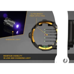 - Adjust brightness to suit any shooting condition with the rheostat light