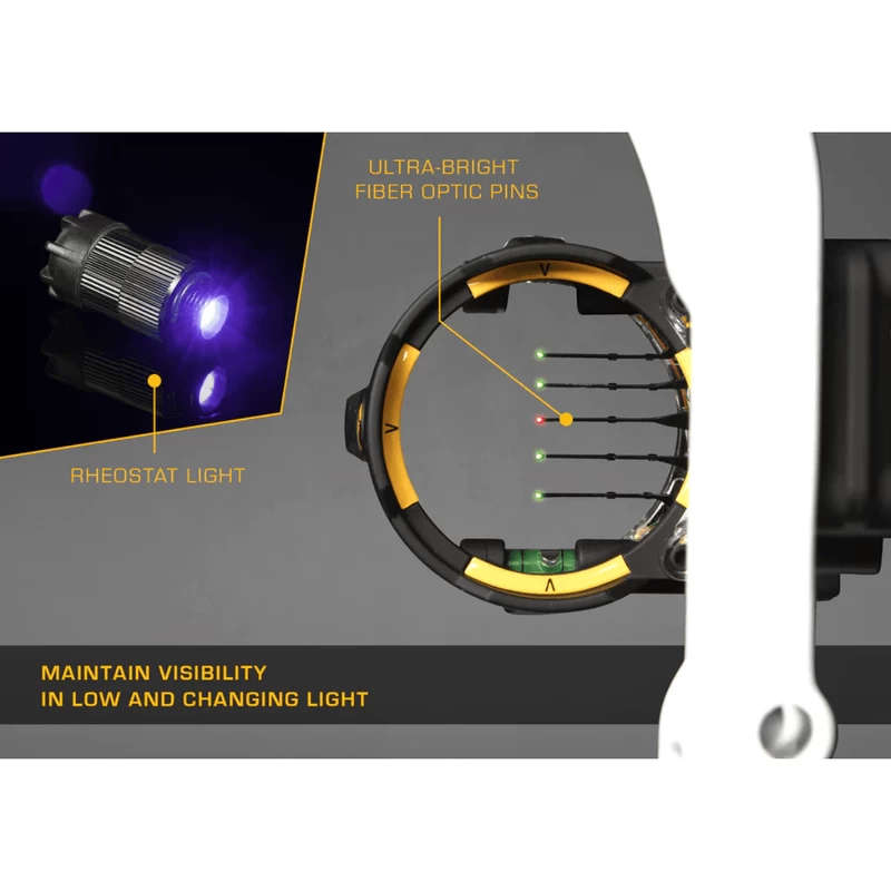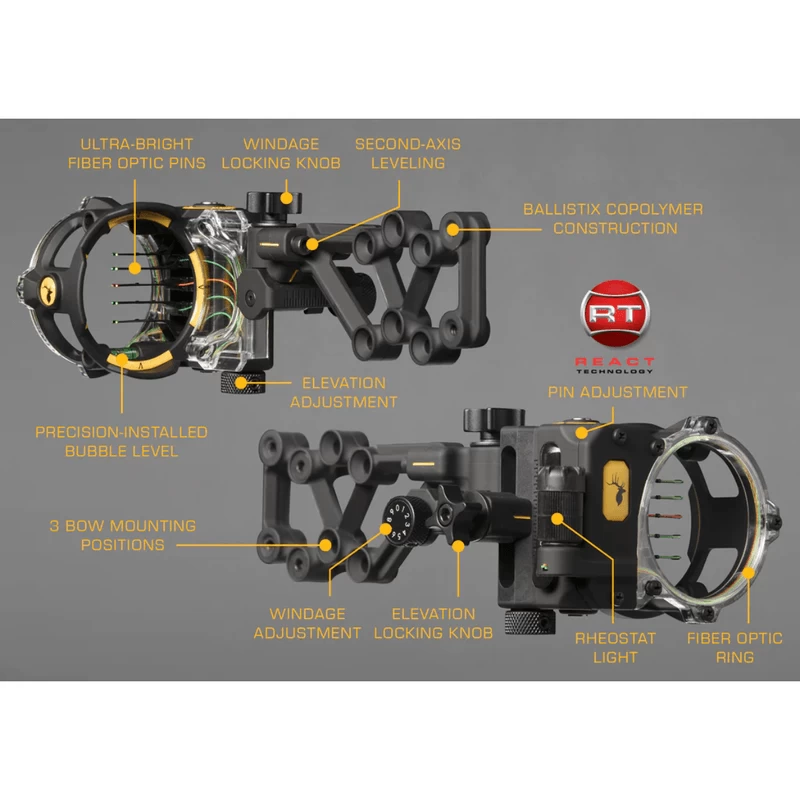 The React H5 features patented React Technology in its 5 horizontally mounted fiber optic pins. This sight offers extreme accuracy up to 60 yards. No other sight gives you the speed and precision of the React sights. Faster to sight in and impossible to be inaccurate, the React sights will make you a better shooter!