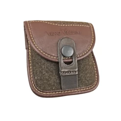 The Vero Vellini Loden cartridge case has a classic brown color, with hand sewn leather trim around all of the edges. The case holds five medium to large big game cartridges up to 3.5” in length and anywhere from .300 to .450 in width. The belt loop fits belts up to 2” (5cm) in width. The case seals with an elastic pull tab over a large button; making access to your ammo in close quarters and by feel, in the dark.